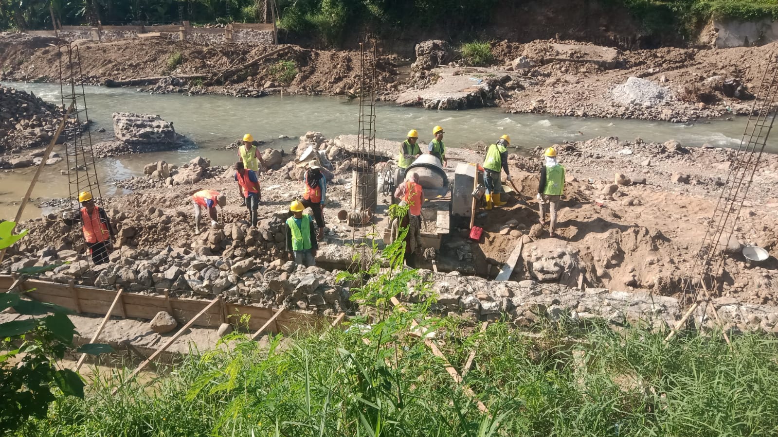 Sementara itu, berdasarkan penelusuran wartawan di lokasi tampak di titik yang sedang dikerjakan tumpukan batu sungai yang dimaksud posisinya berada di sisi pekerjaan seperti bekas digunakan. Sementara pada struktur bangunan terlihat seperti baru dikerjakan ulang oleh para pekerja menggunakan batu dari tumpahan mobil truk pengangkut material.