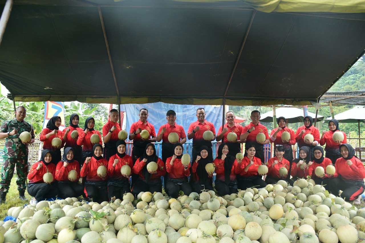 TNI-AL, Korps Marinir, Brigif 4 Mar/BS (Pesawaran) – Dalam rangka memperkuat ketahanan pangan, Komandan Brigade Infanteri 4 Marinir/BS (Danbrigif 4 Mar/BS) Kolonel Marinir Supriadi Tarigan, S.I.P., M.M., bersama Ketua Cabang 7 PG Kormar Ny. Yayuk Supriadi Tarigan, memimpin langsung pelaksanaan panen melon jenis “Pertiwi, Mandala, Merlion Golden” di Kebun Ketahanan Pangan Yonif 7 Marinir (Yonif 7 Mar) yang terletak di Marine 7 Ranch, Ketapang, Teluk Pandan, Pesawaran, Lampung. Senin (30/06/2025).