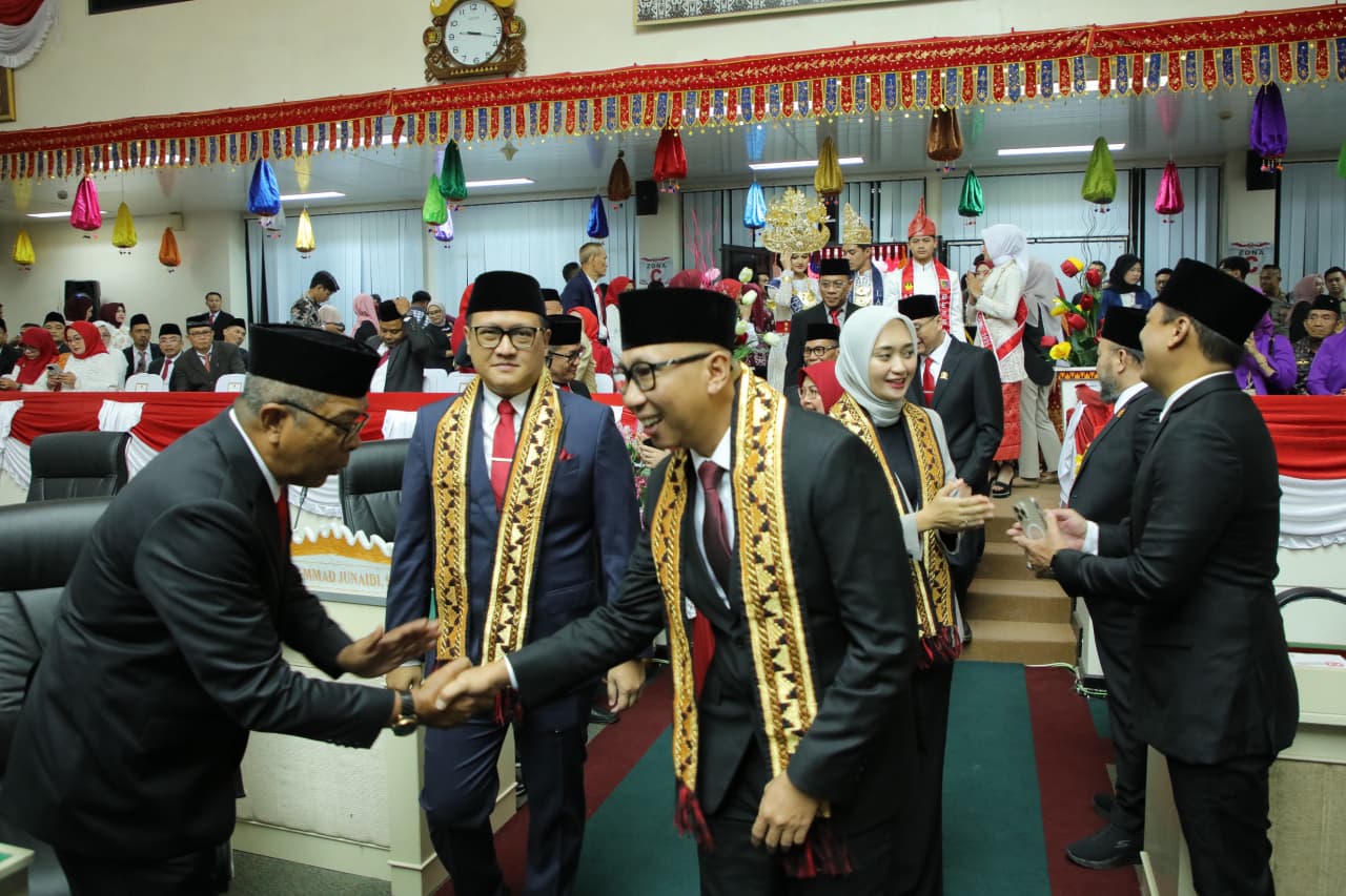 Suasana usai Rapat Paripurna Istimewa DPRD Lampung, Gubernur Rahmat Mirzani Djausal dan Wakil Gubernur Jihan Nurlela bersalaman dengan peserta. Ketua DPRD Lampung Ahmad Giri Akbar tampak tak sadar menoleh ke arah kamera, Jumat (15/8/2025). (Foto: Istimewa)